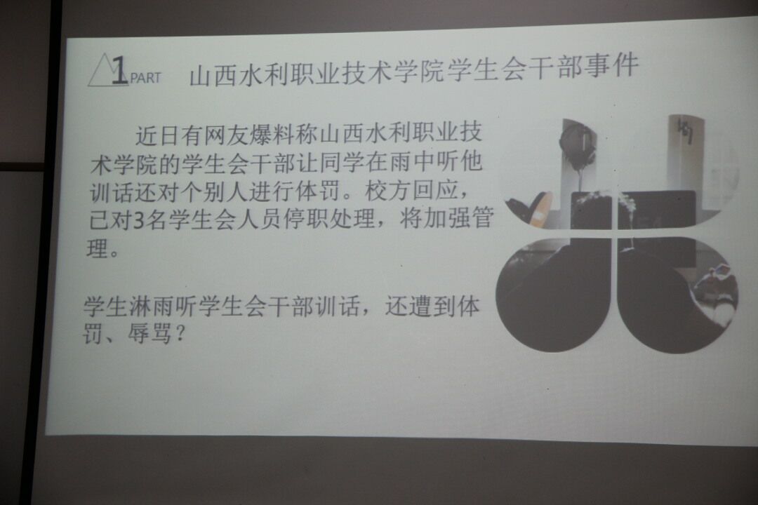近期,山西水利职业技术学院学生会干部要求学生淋雨听其训话的事件曝光,引起舆论热议,也给广大学生会干部敲响警钟。为深入贯彻全国学联制定的《关于学联学生会工作人员改进作风服务同学的若干规定》,3354cc金沙集团团学联学生干部于4月15日晚8点在学院楼1203召开了警示教育主题宣讲会,秘书部部长郑思琪主讲。