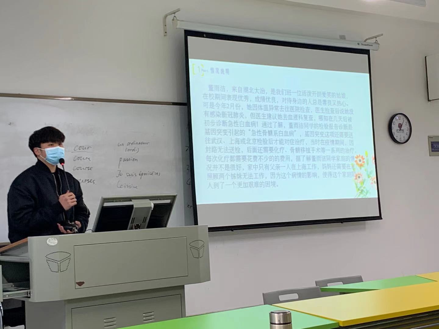 董雨洁同学的辅导员许靖老师,接到消息的第一时间就向董雨洁同学表达了关心与慰问,通过个人资源帮助她联系入住武汉协和医院进行治疗。并召开了法学1804班班委会议,发出爱心倡议书,组织募捐活动。