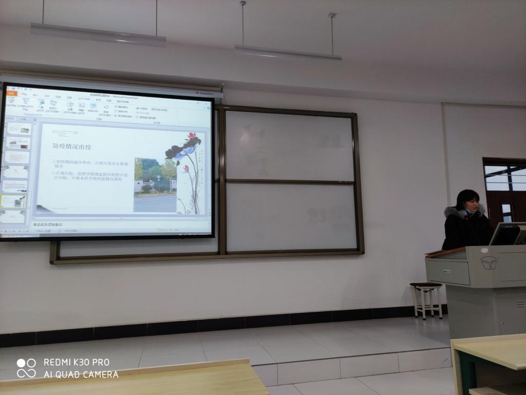 主持人通过PPT,从防疫安全、消防安全、水电安全、出校安全四个方面做出阐述,指出增强个人安全意识的紧迫性和必要性。同时用几个经典案例,给同学们加以提醒,力争消除身边的各种安全隐患。提高同学们的安全防卫知识水平,增强自我保护意识。