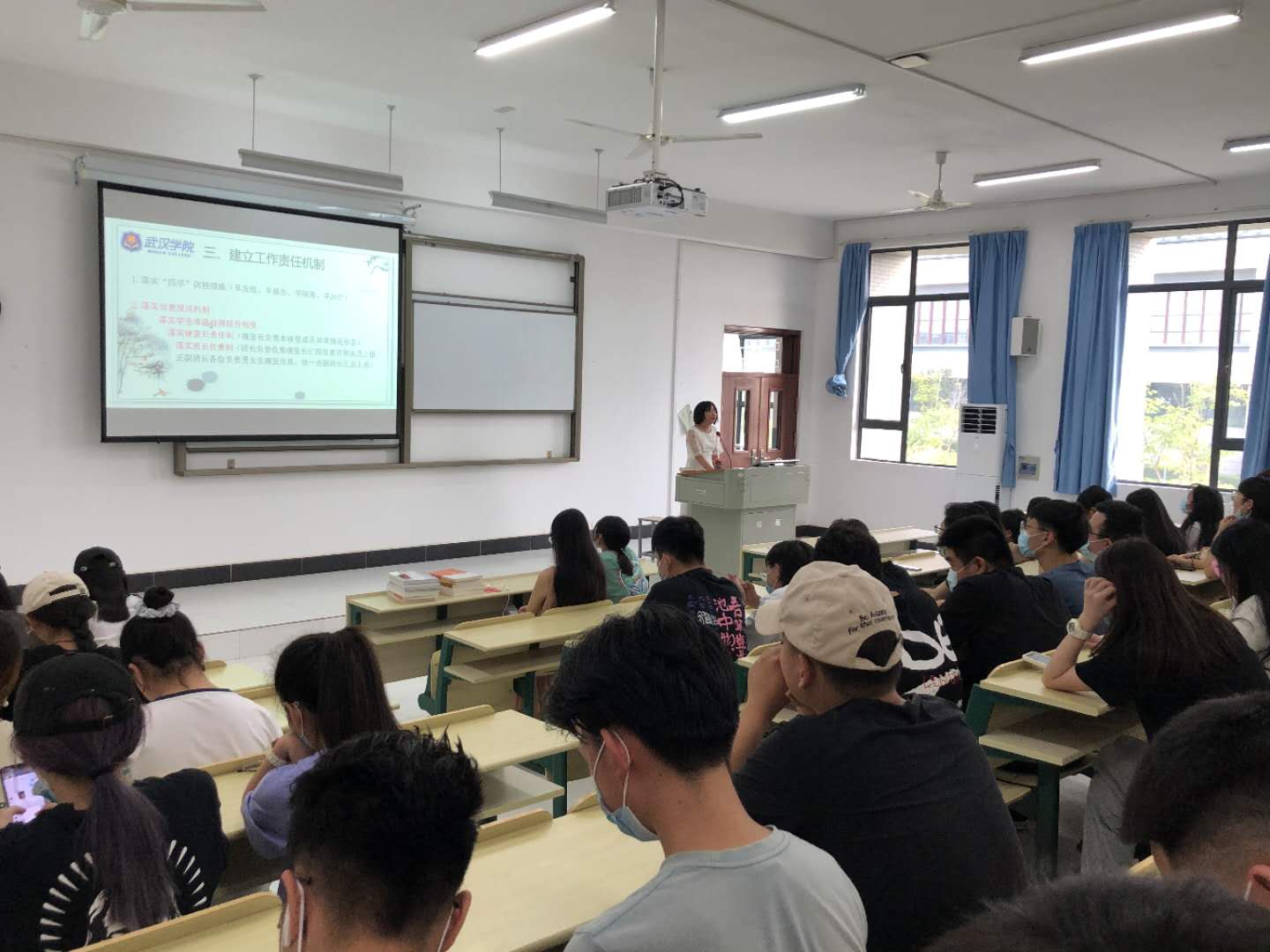 此次班会是由辅导员吴恩婵主持。在阔别校园已久,挺过了“新冠”战役后,吴老师对同学们的到来十分欢迎。2020年注定是个不平凡的鼠年,我们这些千禧宝宝,生于非典之前,战于新冠之时,在经历此次新冠肺炎的重重考验下,我们依旧如约完成了大二下的课程和学习,顺利完成了停课不停学的计划和目标。回望上半年,总结教训,汲取经验。新的学期,新的章程已经开启。对于即将2021年毕业学子们来说,能坐在教室里安心学习上课的日子越发弥足珍贵。