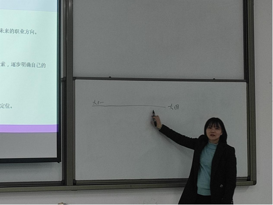 吴恩婵老师利用“心电图”生动举例,在板书上画了一条平直的线,以诙谐的方式告诫大家不要将大学四年的生活过得如“死人一样平淡”,并在黑板下方又画了几条与众不同的线,相比直线更为跌宕起伏。这是老师期望大家能够过得恣意多彩,能够不同于死板的直线,可以在大学四年间翩翩起舞。接着,老师向大家简单介绍了21世纪中国社会的主导职业,警醒大家注意“本科生就业难”的社会现实,同时分别就教师、公务员、律师等热门职业进行了详细的素质要求介绍。