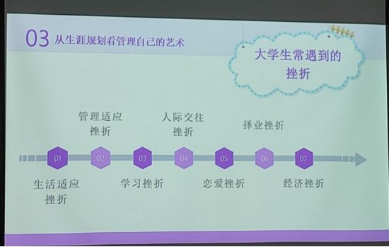 这之后,老师拓展到第三个板块——从生涯规划看管理自己的艺术,并罗列出大学生常遇到的挫折,“遇到这些挫折,你只需要接受就好,这些小挫折与不良情绪只是人生路上的小山包,你真正的山顶还没有攀爬到呢,要学会与自己的不良情绪共存。”生活适应挫折、管理适应挫折、学习挫折、恋爱挫折、经历挫折……在各种各样的挫折中,我们要学会管理自己,学会直面挫折,学会正视不良情绪。