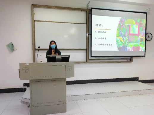 紧接着分享的是法学1803班的朱思同学。朱思同学2022年考研一志愿上岸中国地质大学(武汉)法律硕士。她分别从时间安排、心态调整角度分享了考研的经验,强调了心态调整对于考研的重要性。最后她向同学们表达美好祝愿:“成为更厉害的大人和更可爱的小孩!祝你们好运,不管做什么决定。”