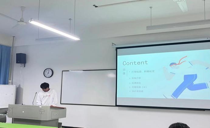 会议开始,邓荣川同学首先从打败社恐,积极社交这一部分开始进行,邓荣川同学提到大学中需要学的东西不只是专业知识,更需要学会的是社交,大学生社交不但能为自己打造更为己广泛的人际关系网,还能锻炼自己的性格,发展自己。并让同学们用自己喜欢的代号向身边的同学介绍自己,帮助社恐的同学们走出社交第一步。