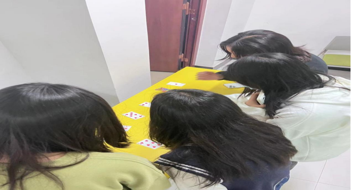 然后,邓荣川同学带领法律事务4班的同学们进行了纸牌游戏,将同学们分为四个小组,每个的小组轮流选出一名同学翻开纸牌,其余小组内同学进行旁观和沟通,直到13张纸牌按照A到K的顺序全部掀开,该小组获胜。纸牌游戏不仅拉近了同学们之间的距离,加强了同学们相互沟通的能力,而且更能打开同学们的内心的窗户,帮助社恐的同学们融入法律事务4班这个大的班集体。