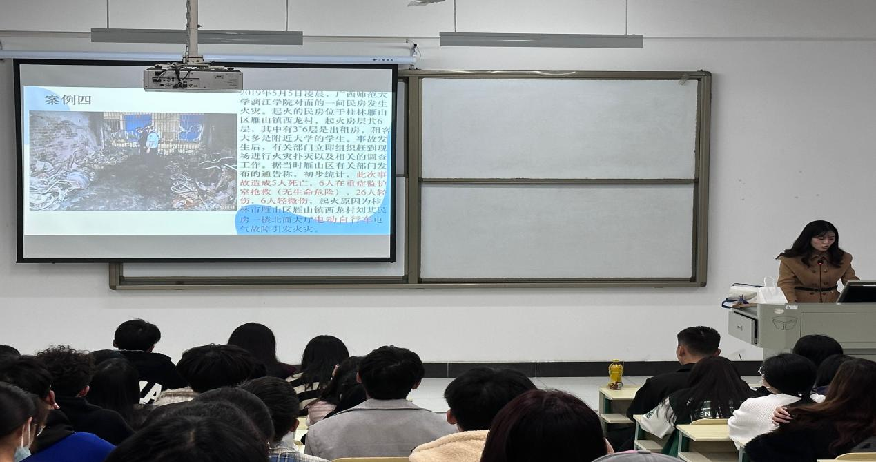 随后,余老师给同学们提出了几个高校火灾案例,皆是在校大学生因为没有遵守宿舍规定违规电器的要求,在使用时操作不规范,所用电器功率过大或正在使用的电器遗忘了将它停止,而造成火灾的发生。在余老师介绍的案例中,轻则无人伤亡只是财物损失,重则致使他人伤亡。在这一件件悲惨的案例中,是一个又一个家庭的破裂。由此,同学们在寝室时一定得注意严禁杜绝使用违规电器,在寝室中看见室友使用时也应及时制止他的使用,不仅是为自己的安全着想也是为他人的安全着想。