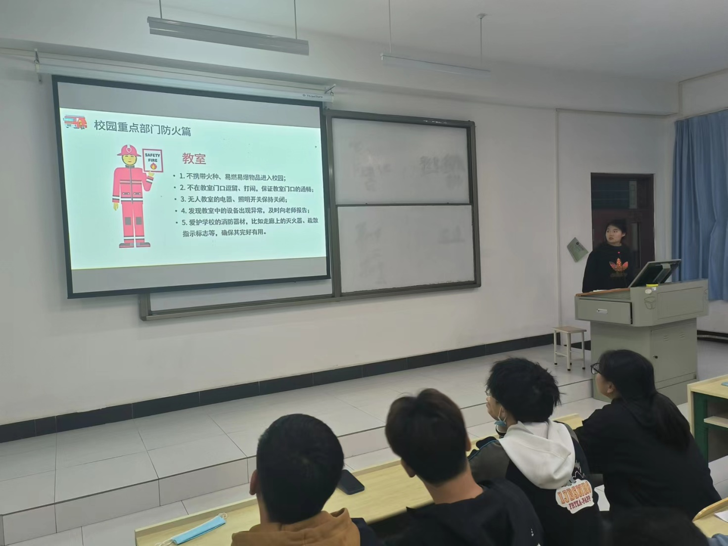 首先,张严文向同学们介绍了消防安全法律法规,并对《消防法》的相关条例进行了详细的讲解,倡导同学们爱护学校消防器械,学习发生火灾时的自救方式。接着,她向同学们讲解了校园重点重点部门的防火,特别强调和同学们息息相关的寝室、教室是学生中最容易引发火灾的地点。