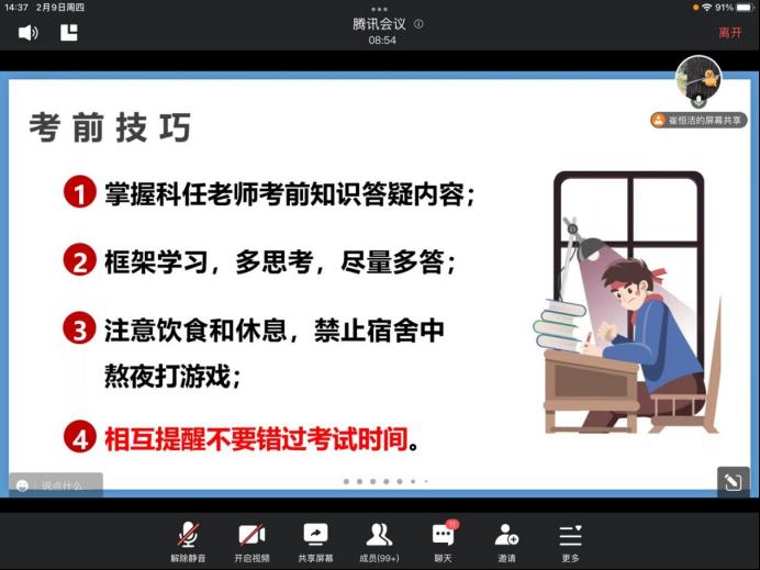 最后,崔老师还分享了关于考试前的小技巧,督促同学们务必掌握科任老师上课的重点知识,做到反复巩固,并且提醒同学们注意劳逸结合,适当放松心情。