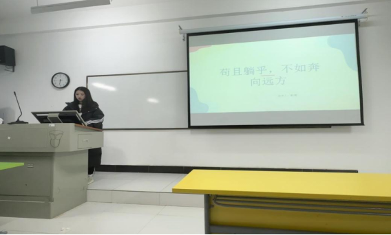 紧接着,靳璨同学将幸福和快乐进行了区分。她指出,快乐是短暂的,对于人的生命历程而言是无法永久保留的,它无法构成人生的成就。快乐终究不能满足生活的意义。她带领同学们一同探讨了躺平、快乐和幸福这三者之间的关系,并提出躺平只是短暂的,它也无法铸就人生的成就。躺平基本上是与快乐挂钩的,而非与幸福。最后一部分的内容是“拒绝躺平”,靳璨以钟南山院士和张桂梅校长的事迹为例,呼吁大家不要选择躺平,而是要充分利用大学宝贵的时光,努力前行,追求自己的梦想。“人无远虑必有近忧”,并强调“躺平”只能逃避一时的伤害,却永远无法达到追寻诗和远方的目标。