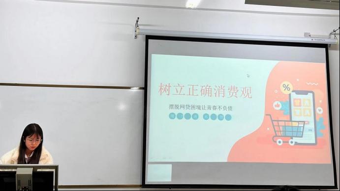 随后,汪思琪针对大学生中愈发严重的不合理消费现象,向同学们提出四点树立正确消费观的方法。一、树立理性消费观念,合理安排生活支出,增强自控力,做到量入为出、适度消费,拒绝过度消费和超前消费;二、提高自我保护意识,主动了解贷款的金融知识和相关法律法规,学会辨别网络真伪;三、强化信用意识,注意保护个人信息,学会维护自身权益;四、提高风险意识,警惕网络传销和非法集资等违法行为,脚踏实地、勤奋学习,用奋斗创造幸福生活。