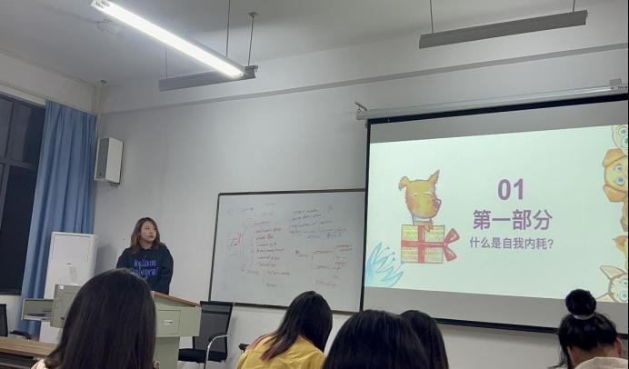 心理委员杨雨佳首先介绍了自我内耗的概念,明确了它的特征和表现形式。她指出,自我内耗通常表现为拖延、选择困难、过度自我要求以及过分关注过去和未来的趋势。这一部分的目的是帮助参与者认识到学生们可能存在的自我内耗问题。接下来详细讨论了导致自我内耗的各种原因,包括社会压力、自我期望、焦虑等。她还强调了自我内耗对个人生活和工作的消极影响,如降低工作效率、影响心理健康等。这有助于参与者理解自我内耗的深层原因以及其潜在影响。最后心理委员杨雨佳分享了一系列应对自我内耗的策略。她强调了制定明确的目标和计划、放松和自我关怀的重要性,以及寻求支持和专业帮助的必要性。这一部分提供了实际的工具和方法,帮助参与者主动应对自我内耗问题。