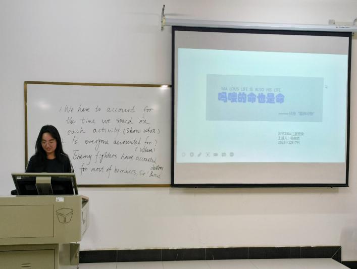 会议伊始,杨画然向同学们介绍当下的热点话题——“吗喽”文学。她谈到,当代年轻人因“吗喽”丑萌的形象和疲惫的面容而将其带入自己,借用“吗喽”将自己生活中遇到的困境以调侃的方式表达出来,这是从被动自嘲到主动自嘲,甚至乐于自嘲的心态转变。自嘲的背后,是同学们发现自身平凡并与自己和解的过程。
