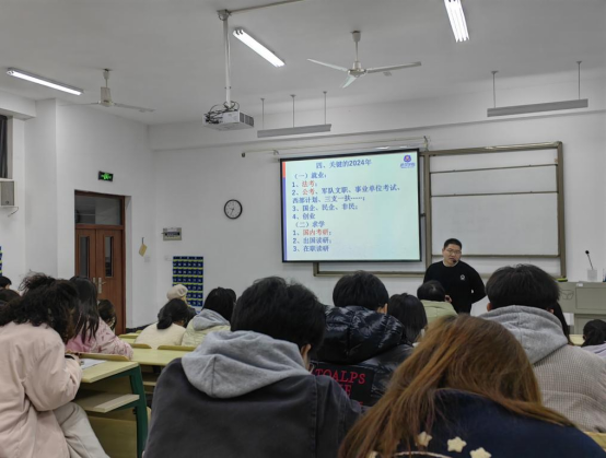 接着,彭老师提到同学们的专业课学习情况,将各班大三上学期的期末情况大致进行的展示,由此引出同学们即将迎来的考研、法考和考公等,彭老师再一次强调今年的关键性和重要性,希望同学们不管是继续深造还是就业,找准目标就要为之不断奋斗,坚定自己信念。