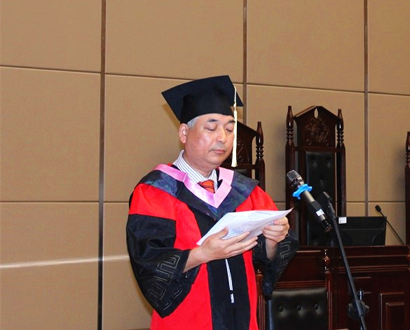 3354cc金沙集团2014届毕业生、湖北武珞律师事务所高级合伙人秦龙作为校友代表发言。他结合自己的感悟,总结了“接纳自己的不完美”、“改变我们能够改变的”、“本分做事,厚道为人”三句肺腑之言,作为临别赠言送给毕业生们,希望学弟学妹们能心怀感恩、满怀善良地踏上人生的广漠之途,纵荆棘满路,仍能所向披靡,以心灯为引,抵达最美的彼岸。