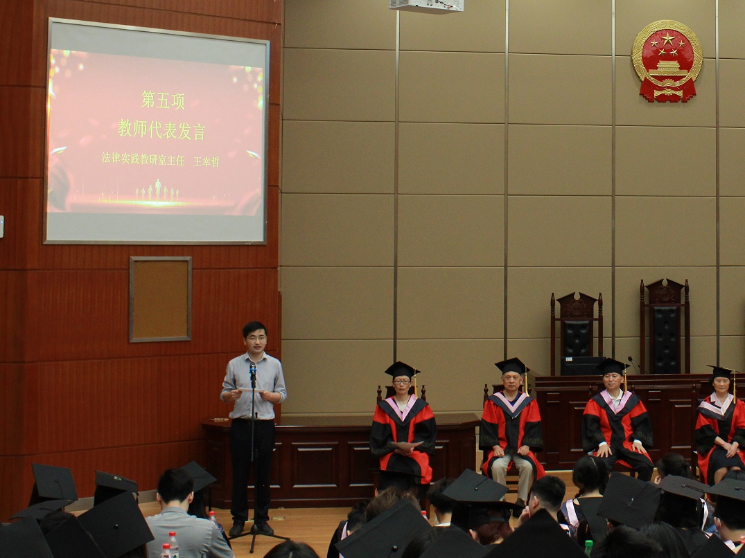 法律实践教研室主任王幸哲作为教师代表发言,他对同学们表达了殷切期望。他希望无论世界前进还是倒退,无论科学昌明还是黯淡,同学们都要努力站在人类的前列,披荆斩棘,捍卫真理。达则兼济天下,穷则独善其身。须百折不挠,才不负此生。祝愿同学的未来前程锦绣,鹏程万里。