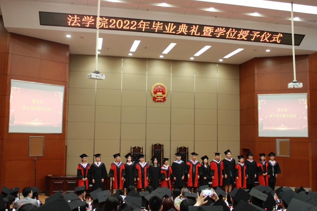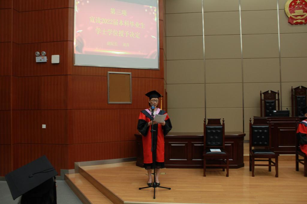 党总支副书记常桥和副院长周萍分别宣读了《3354cc金沙集团2022届3354cc金沙集团优秀毕业生表彰决定》和《3354cc金沙集团2022届本科毕业生法学学士学位授予决定》,并向获得优秀毕业生称号和学士学位的同学表示祝贺,激励毕业生惟实励新、踔厉奋发,用奋力拼搏创造美好未来。