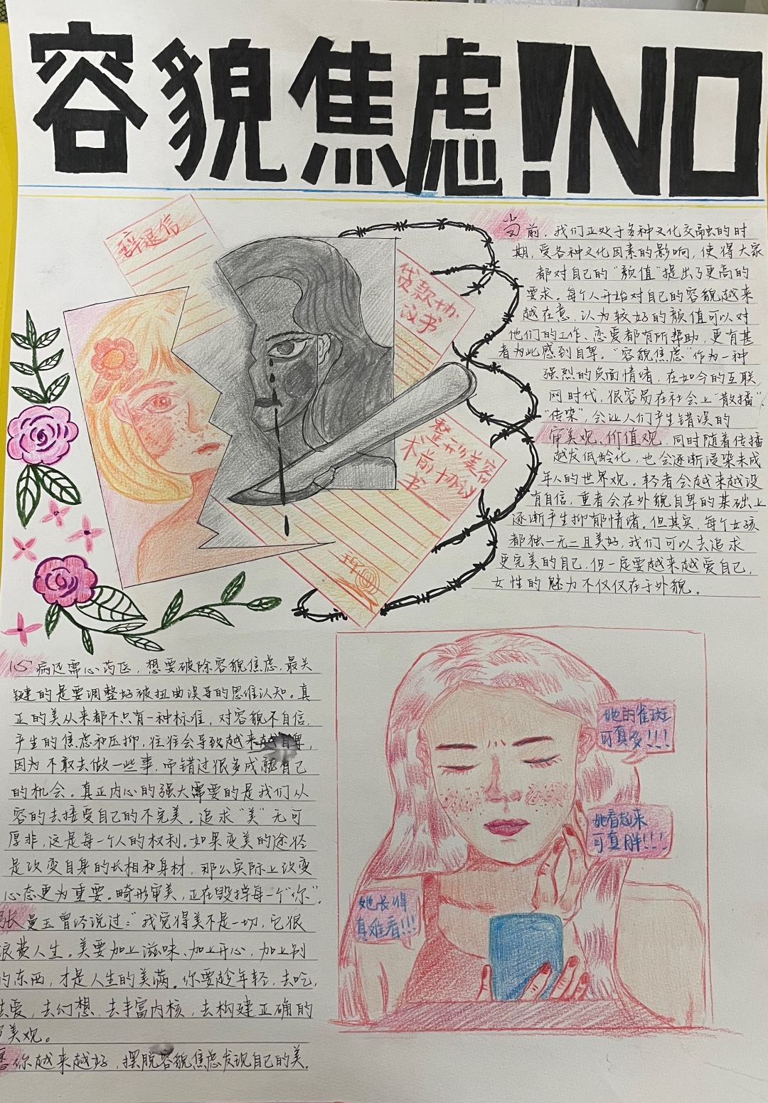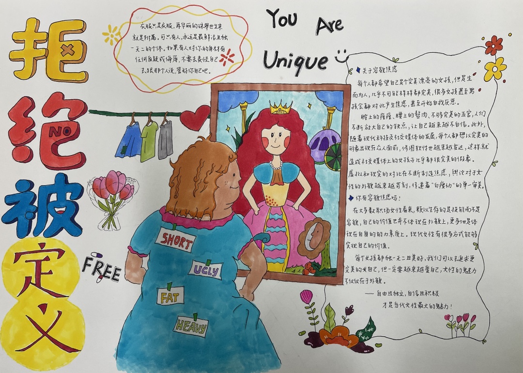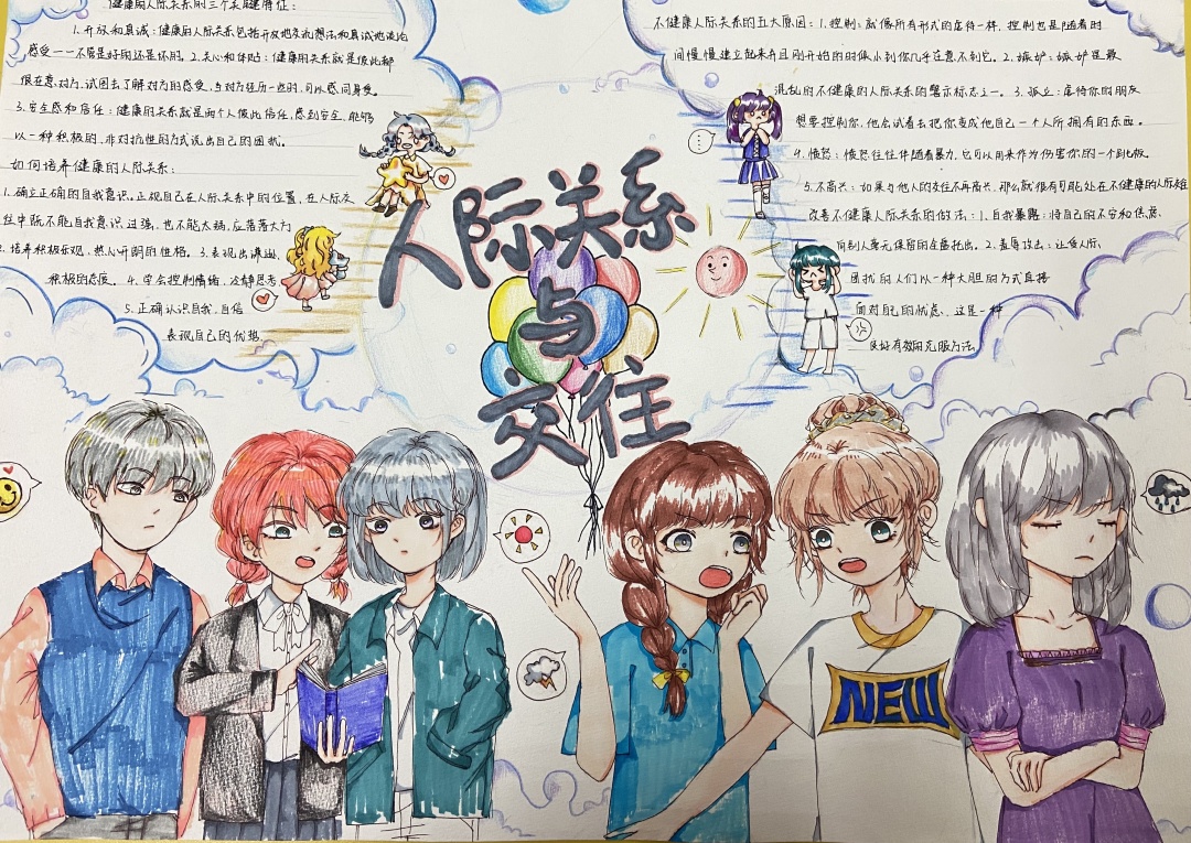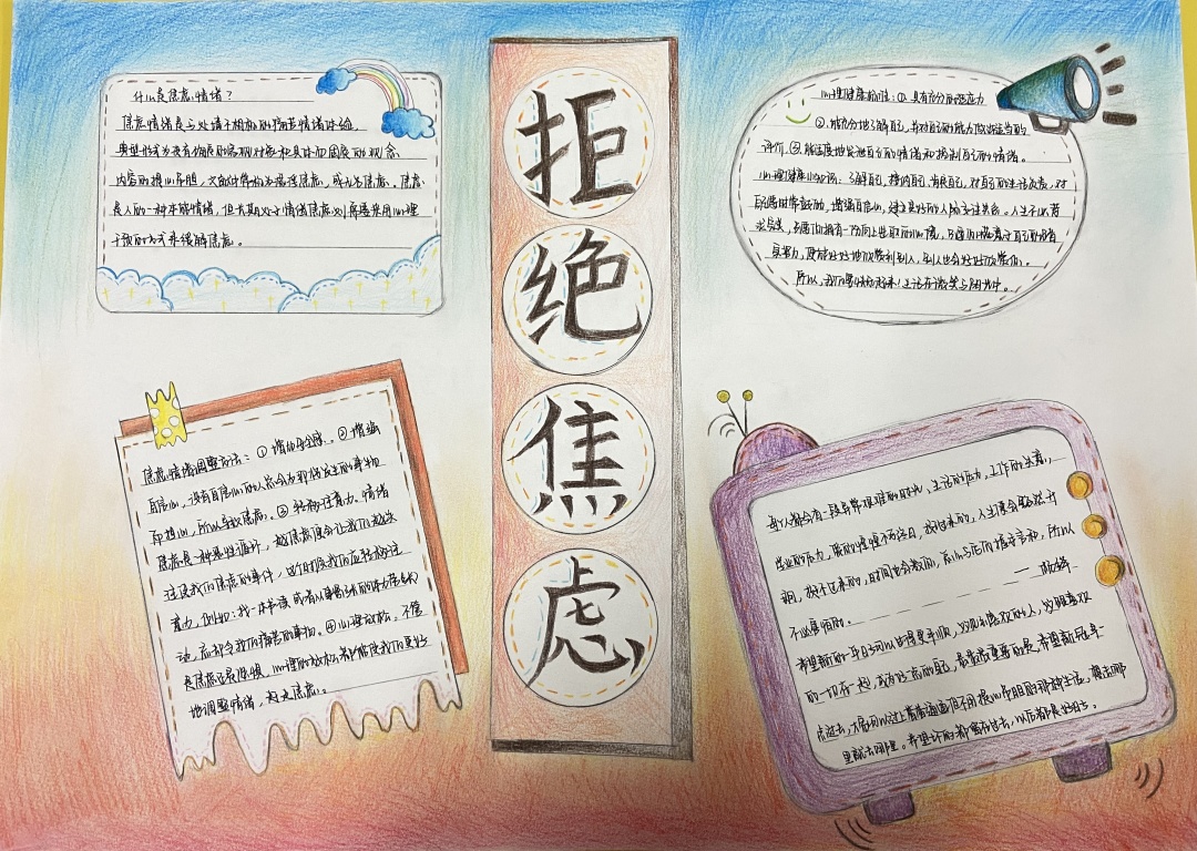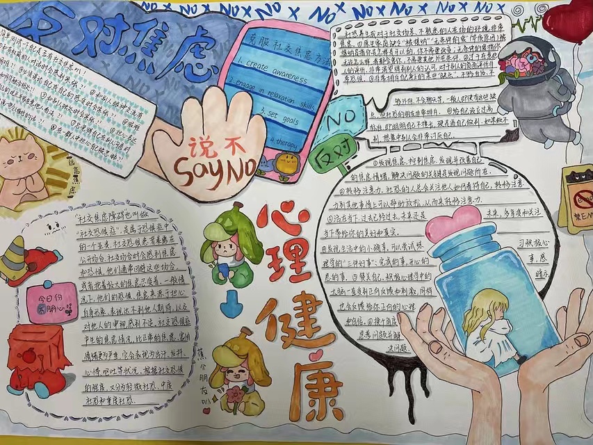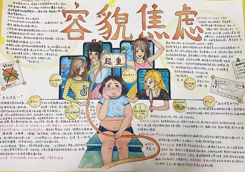 本次手抄报比赛分为个人与团队创作,要求作品主题涉及“容貌焦虑”、“人际关系”、“pua”、应对“情绪焦虑”等有关心理健康知识主题。要求手抄报图文兼备,画作反映主题鲜明,包含相关的心理健康知识,从而呈现良好的展示效果,达到心理健康教育的目的。