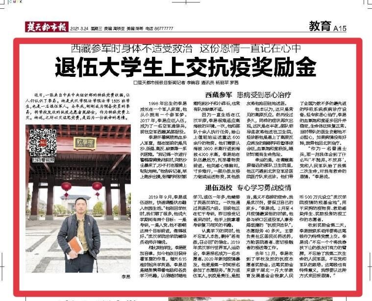 而在疫情结束后,李易同志也将发放的志愿者奖励金作为大额党费上交中共中央组织部,该事例作为先进大学生的事迹被楚天都市报教育版登载。