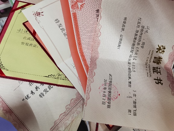 自进入大学以来,在这个充满挑战的环境里,我感受到了知识的重要性,更感受到了肩上的责任重大。过去的三年里,我在抓好理论学习的同时不断拓展自己的专业技能,通过参加创新创业大赛、多次寒暑假的自主实习提升自己理论结合实践的能力。我的作品“军歌的第二个vlog”荣获2019年湖北省大学生文创作品优秀奖,作为“互联网+社区普法”、“PlanB法律传媒公司”大学生创新创业训练项目团队成员和“大学生互联网普法社群”项目的省级项目主持人,作品《热血青春 红色热情》荣获学院H5作品比赛一等奖。通过自己的努力去达成一个个目标是倍儿有成就感的事。