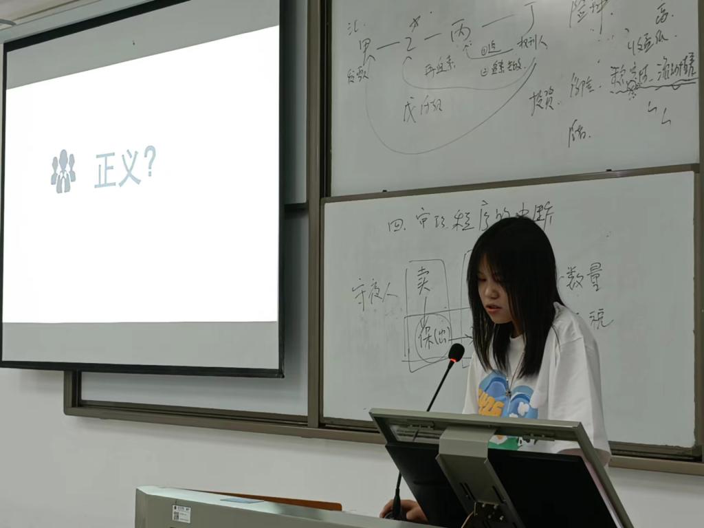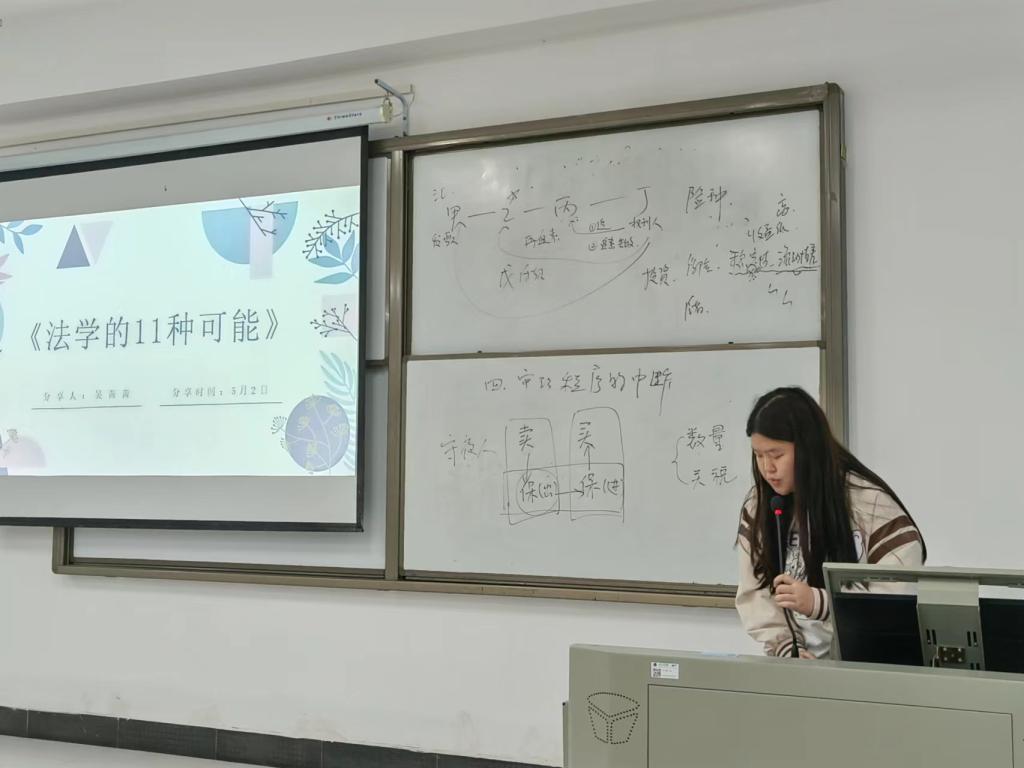 来自法务2002班的吴茜茜分享了书籍《法学的11种可能》,她首先以视频的形式为大家展示了这本书,接着特别分析了知识产权与知识产权法以及我国研究知识产权的现状。法务2002班的方园则从背景、内容和感悟分享了书籍《乌合之众》,“群体有时会成为犯罪的推动者,每一个人的责任得到了分散,道德自律被削弱”是她的心得。法学2105班的王光眺通过对《法律是什么》的分享,向大家解释了“什么是法律”这个困扰很多法学初学者的问题。来自法学2102班的黄毅辉则通过对书籍《论法的精神》的分享,在介绍了书中的宪政、刑法和法学思想的同时,提出了自己的读后感悟,即阅读需要跳出舒适圈,这次阅读不仅使他感受到了自己知识点的薄弱,同时也庆幸自己生活在法律的自由之下。法务2001班的丁茜和法学2102班的黎圣然均分享了书籍《看得见的正义》,其中,丁茜提到了程序正义,怎么样算是真正的公平正义,迟到的正义为非正义;黎圣然则提到了当权利受到侵害,救济是否能被给予及对我国司法权的思考。