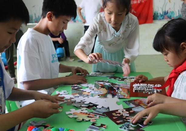 “我们是共产主义接班人,继承革命先辈的光荣传统,爱祖国,爱人民,鲜艳的红领巾飘扬在前胸……”课程的最后,实践团为孩子们佩戴红领巾,共同合唱中国少年先锋队队歌《我们是共产主义接班人》。团队成员们用红色故事主题的拼图、油画等辅助方式让孩子们更直观地了解本堂课的理论知识。最后,实践团与孩子们在欢声笑语和念念不舍中道别。
