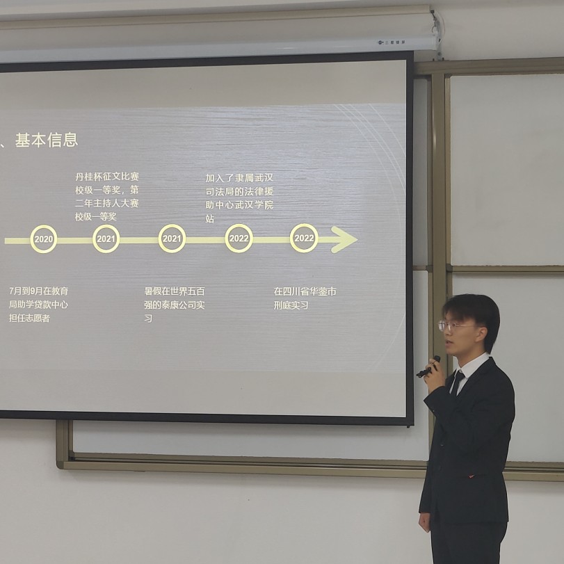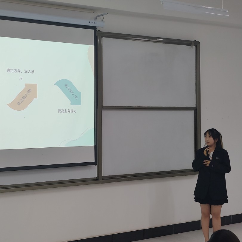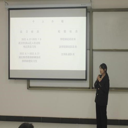 展示结束后,王夏欣同学作为“2021年全国大学生模拟求职大赛”湖北省赛区二等奖的获得者,分享了自己参加模拟求职大赛的经验。她主要从能力的迁移、简历内容的丰富、职业情怀三个方面为大家进行分享。她指出,求职的大学生应注意将校园经历和社会经历与向往职业的相关工作能力挂钩,充分展现自己对竞聘该职业的能力优势;简历的内容不应单单只追求应试性,一定要有创意和亮点,具有多元化色彩,能够抓住面试官的眼球;同时要充分考虑自身的职业情怀,自己究竟是否热爱这份工作。王夏欣同学的发言简短却一语中的,引发了在场选手们的深入思考,也让大家进一步明确了自己应该努力的方向。