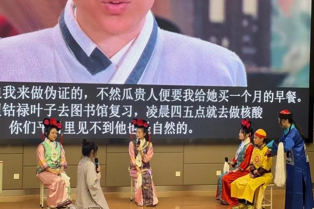 将现场气氛推向高潮的当属“治安大队”了,前面对同学们家乡的美景、美食、美人的介绍就已经引得观众们感叹不已,“治安大队”演绎的《甄嬛传》小剧场,更是以口音浓重的方言和夸张搞笑的表演,赢得了大家的阵阵欢呼和朗朗笑声。而“六位帝皇丸”战队,则是为我们带来了不一样的《封校传》,他们以当代疫情防控中不可忽视的核酸检测为切入点,改编演绎了《甄嬛传》中出圈的桥段,引发了在场观众的热烈反响,气氛十分欢乐,且与之情景相呼应的服装道具也体现了他们的用心,表演十分精彩。