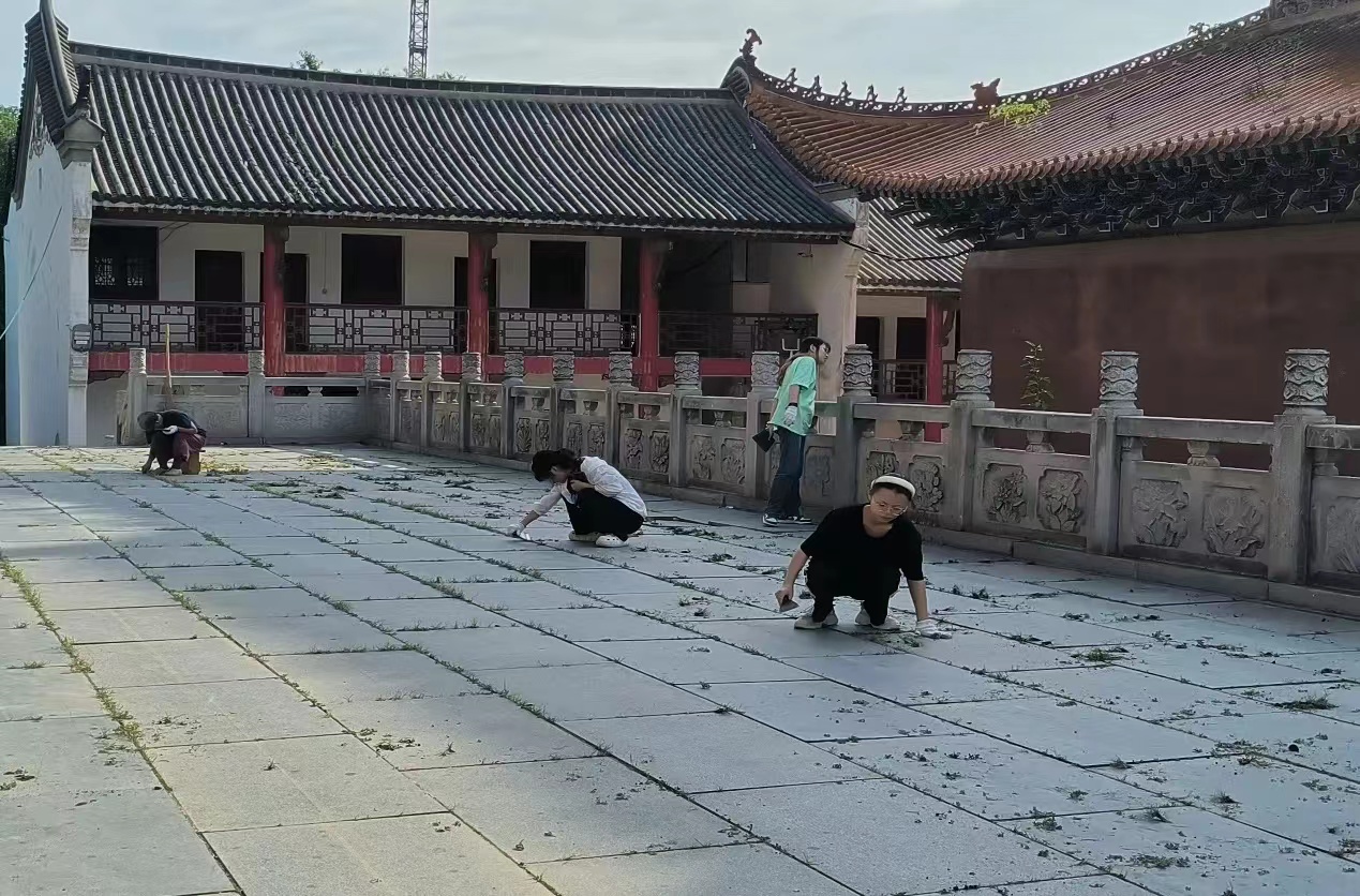 随后,景德寺的师父向团队成员介绍到,“住在寺里叫‘挂单’,这类似于酒店办理入住,登记好信息给人安排房间,对入住的人员负责。有人挂单入住,涉及到的工作就有:接待、登记、查房、打扫房间卫生、维护公共区域卫生、床单被罩等物品清洁……同时景德寺的工作还有建设寺院环境建设、打扫庭院卫生、布置学修活动场地等等,”团队成员在师父带领下开始劳动工作,整理寺院,打扫卫生,除草去根。寺庙为人们提供如此的干净,安宁的清修之地,和寺庙的师父一起守护花草,保护每一片枝叶的从容生长,收拾落叶,打扫殿堂,帮助完成寺院内所需要的工作,在寺庙的义工工作给团队成员们带来全新的体验,这些工作存在的意义也是青年人应自觉承担责任,传递爱心,传播文明,弘扬精神的体现。