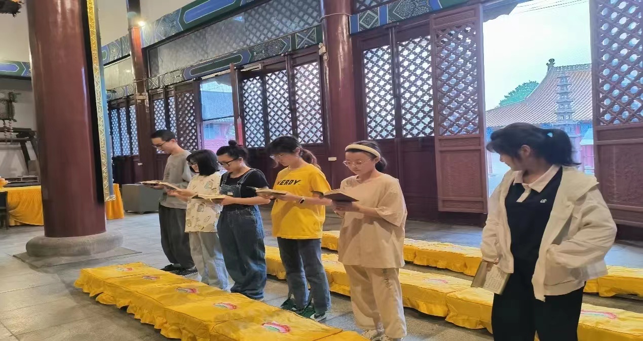 7月18日上午,团队成员早早起床,跟着寺院的师父体会上早课,早课即佛教早晚课诵中的一部分,早晚课诵是汉传佛教的传统,是寺院每日必持的修行功课,也是传统佛文化最基本、最普遍的仪轨,课诵分为朝暮二时,通称早晚“两遍殿”,即每日于清晨与入暮时分,寺院僧众齐集大殿,念诵经文,这是法师们每日早晚必须进行的修行。团队成员跟着寺院师父体验观摩了众多僧侣文化,这也是寺庙文化的重要组成部分,僧侣们修行、讲经、念佛、打坐,传承和弘扬着佛教文化,是寺庙文化的重要代表。寺庙的师父说到:“我们每日都上早晚课,正是通过这样一个长期坚持的过程,我们在这一过程中渐渐消除自身放逸懒惰的习气,让修行人精进不懈怠,勤奋不懒惰。”