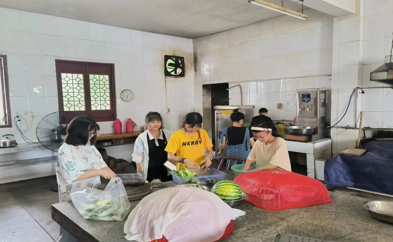寺庙里面吃饭的地方叫斋堂,斋堂最里面就是大寮,简单说大寮就是寺里做饭的地方,负责全寺的伙食,景德寺的做法师父是一位爷爷。一提及做饭,那在大寮里面要干的活就多了:择菜、洗菜、切菜、炒菜、蒸米饭、蒸馒头、行堂打饭、洗碗刷桶、打扫卫生……这些工作门槛不高,上限很高,需要大量的人力,尤其是寺庙里面节有活动的时候。在斋堂吃完早饭后,团队成员留在斋堂帮助斋堂的爷爷一起打扫地面,清理桌面, 洗切蔬菜,准备中午的斋饭。“这些年轻人干活都做得很好,在他们的帮助下,我们很快的就准备好了食材。多亏他们在,帮助我们一起把厨房、斋堂全部打扫一遍,弄得非常干净”,大寮的做饭爷爷称赞到。