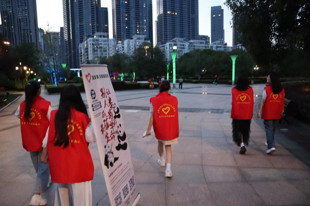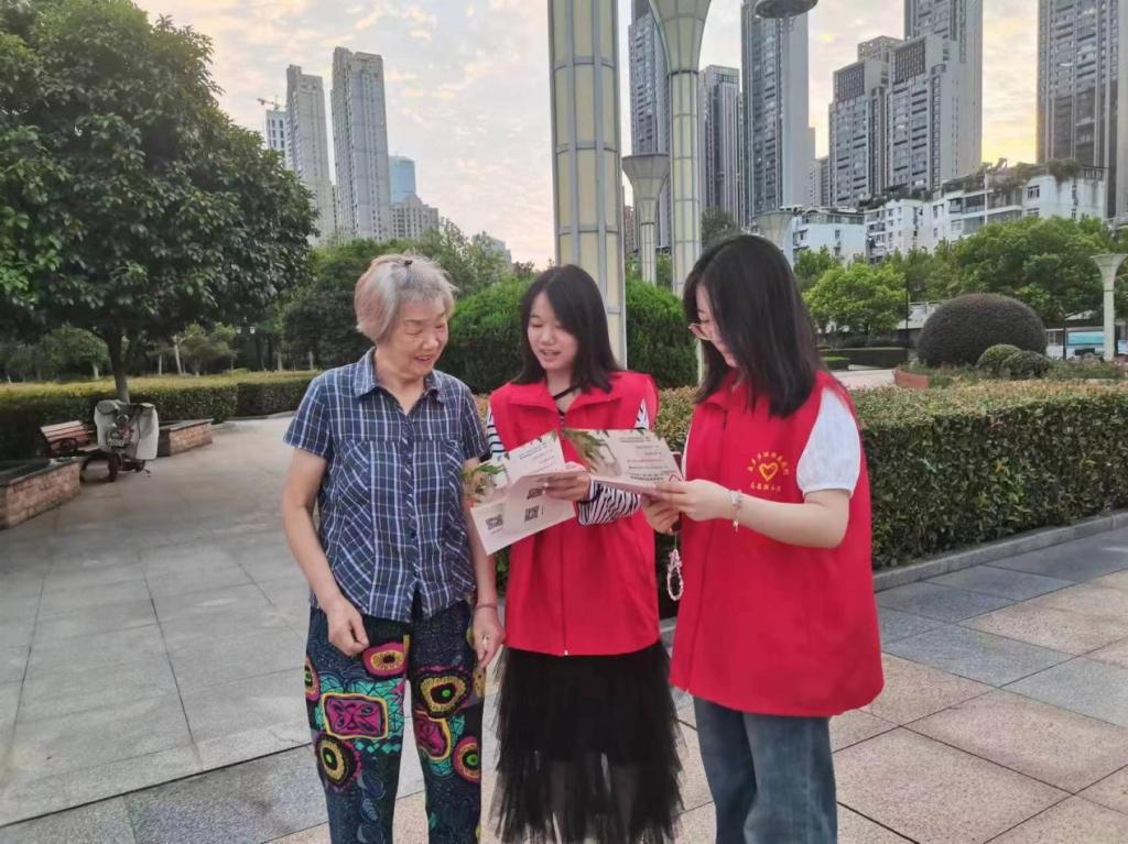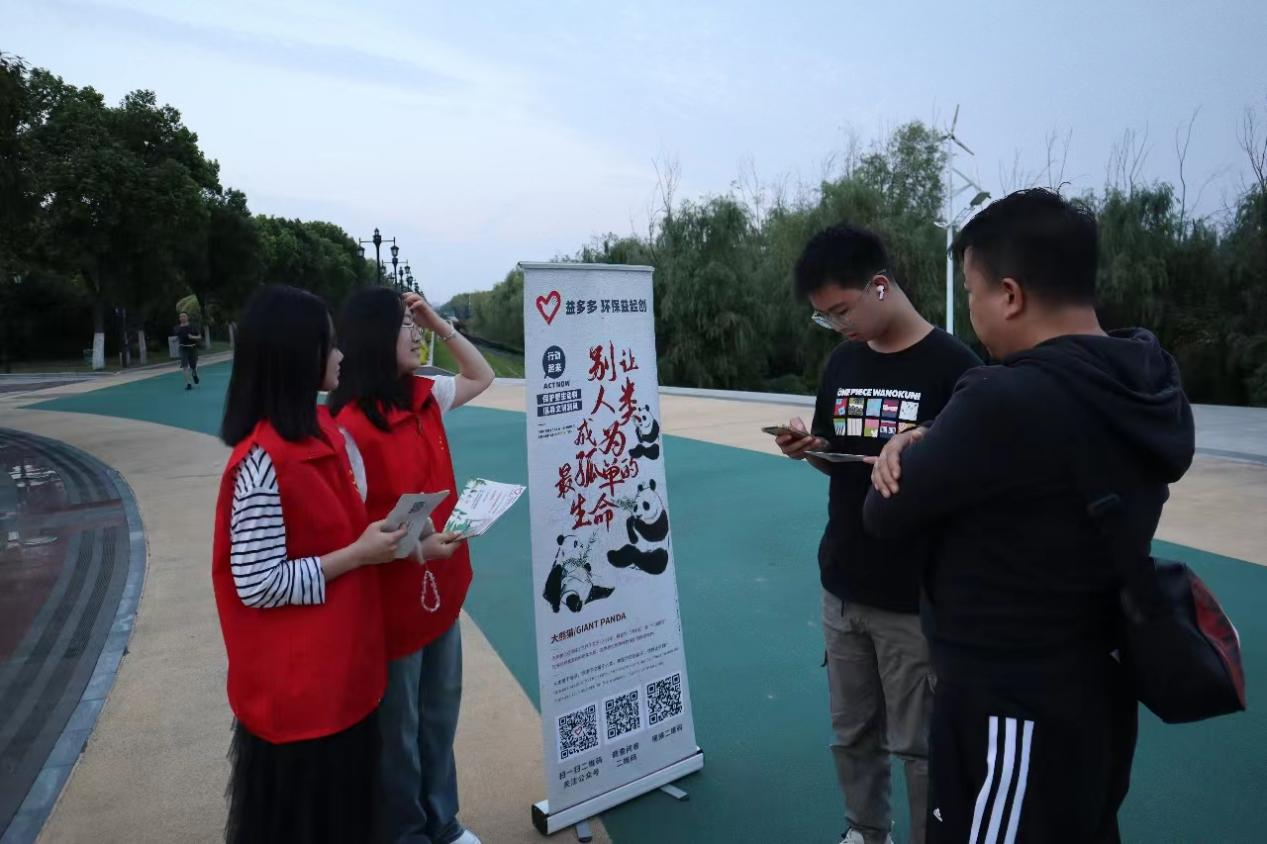 活动结束之际,夜幕悄然降临。一名来自江汉大学的大学生对我们的活动宣传很感兴趣,主动与团队成员进行交流了解。