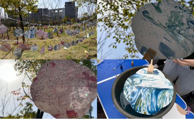 活动工作人员提前学习漆扇的制作步骤并在活动开始前动手尝试,以更好地帮助活动参与者完成漆扇的制作。在将所需物品摆放好后,陆续有学生前来排队领取扇子等待制作。同学们挑选自己喜欢的颜色颜料滴入水中,扇子入水后颜色便附着于扇子上,水的波纹与多彩的脉络使扇子鲜活生动。在活动现场,分发、辅助制作、晾晒、回收形成一个完整的“流水线”。一个个扇子出水如芙蓉,使现场好一片热闹。