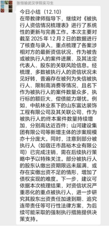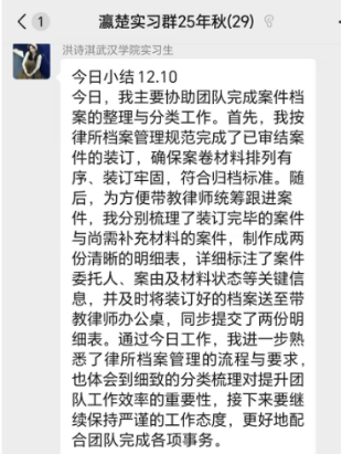 湖北瀛楚律师事务所对22名实习生实行系统化、精细化管理:将学生编入律师团队,实施打卡考勤与每日工作复盘制度,并发挥学生骨干带头作用。实习生可全面参与案卷整理、文书撰写、合同审查、案件跟进及庭审旁听等全流程实务,在真实案件中锤炼能力。