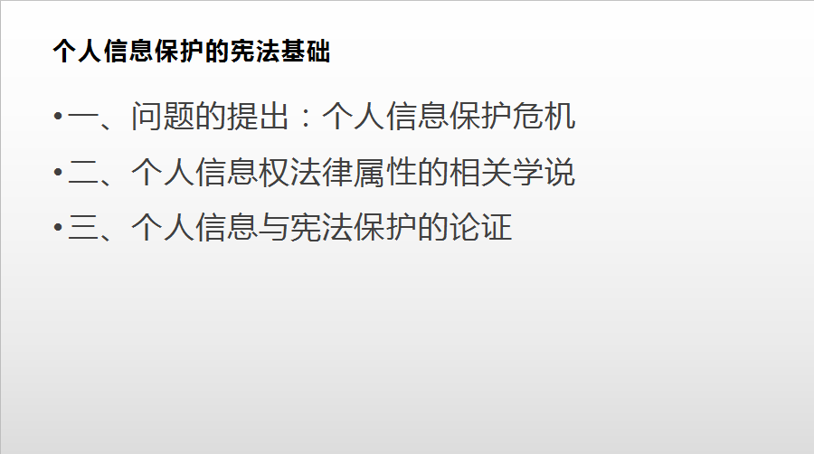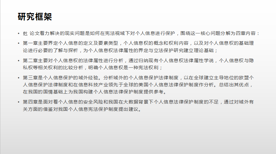 周紫阳老师首先介绍了申报项目的研究框架,论文着力解决的现实问题是如何在宪法视域下对个人信息进行保护,围绕这一核心问题分解为四章内容。随后从问题的提出、个人信息权法律属性的相关学说、个人信息与宪法保护的论证三个方面进行了详细介绍。